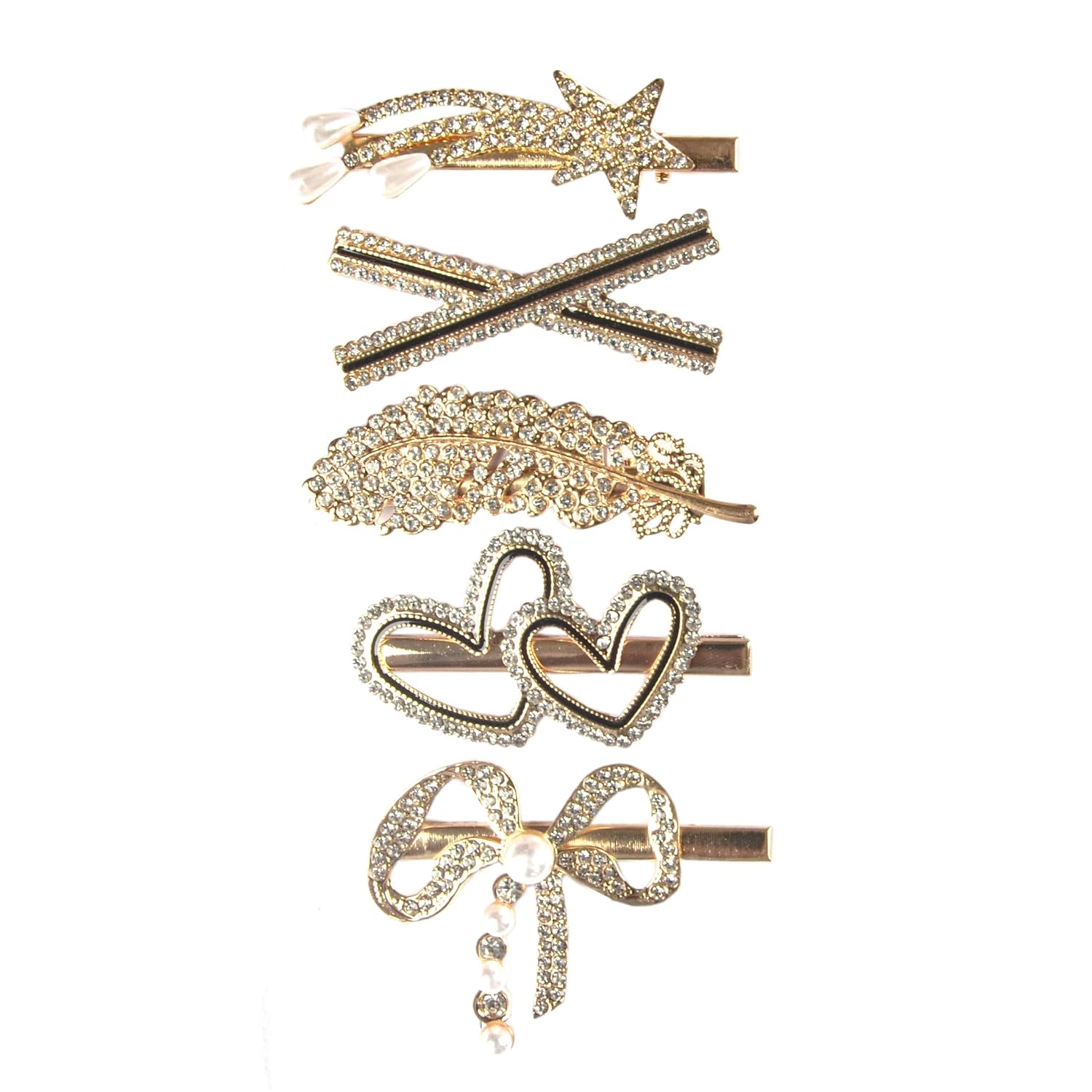 This set includes 5 stylish metal hair clips, each featuring a unique design with an elegant golden finish. Carefully selected to offer variety, the clips combine classic styling with modern fashion trends, making them suitable for everyday wear as well as special occasions.